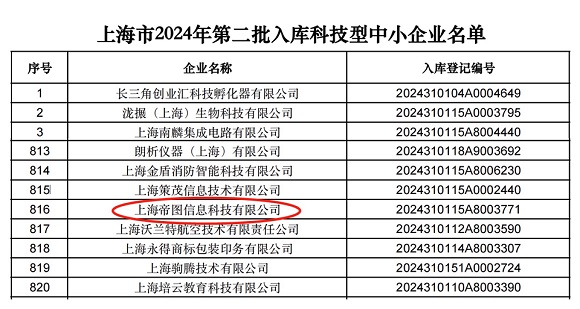 9月5日,上海科學技術委員會發(fā)布的《上海市2024年第二批入庫科技型中小企業(yè)名單》,上海帝圖信息科技有限公司再次上榜!